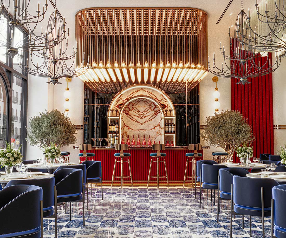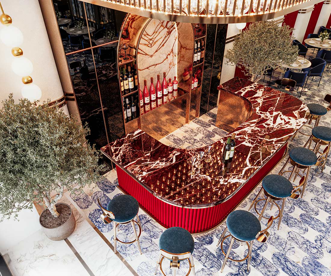 At the heart of the hotel stands the signature bar — a fluted red counter topped with polished marble and framed in brass, illuminated by a bespoke chandelier that adds a sense of drama and allure.