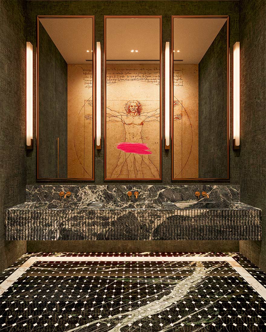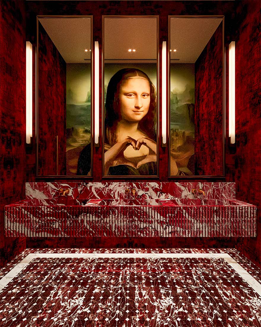 In the restrooms, classical art meets contemporary wit through reimagined masterpieces and bold marble detailing, adding a playful twist to the refined aesthetic.