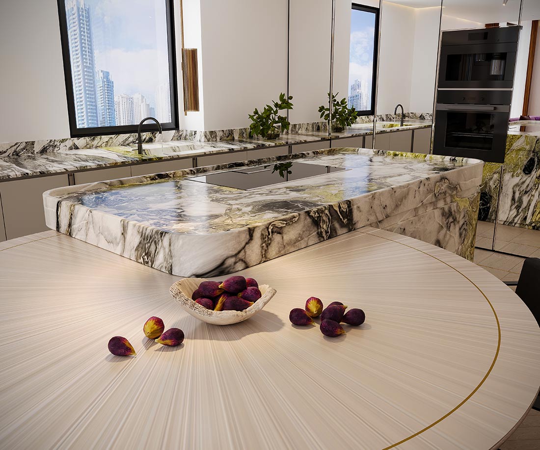 Natural daylight drifts through expansive glazing, softly touching warm wood surfaces and expressive marble, creating a space that feels gentle, airy, and effortlessly refined. The palette is intentionally restrained, allowing textures and light to shape the experience rather than overwhelm it.