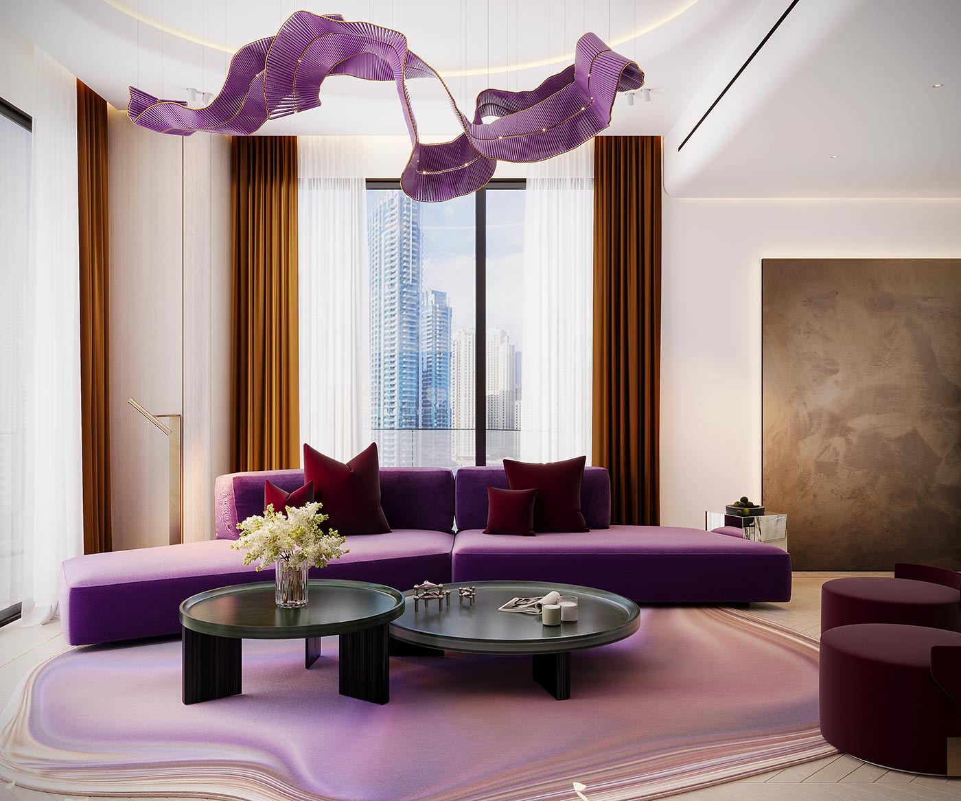 A sculptural statement chandelier floats above the living space like a piece of art, adding character and identity while preserving the serenity of the interior. Every detail, line, and proportion has been carefully considered to create harmony nothing feels excessive, yet everything feels complete.