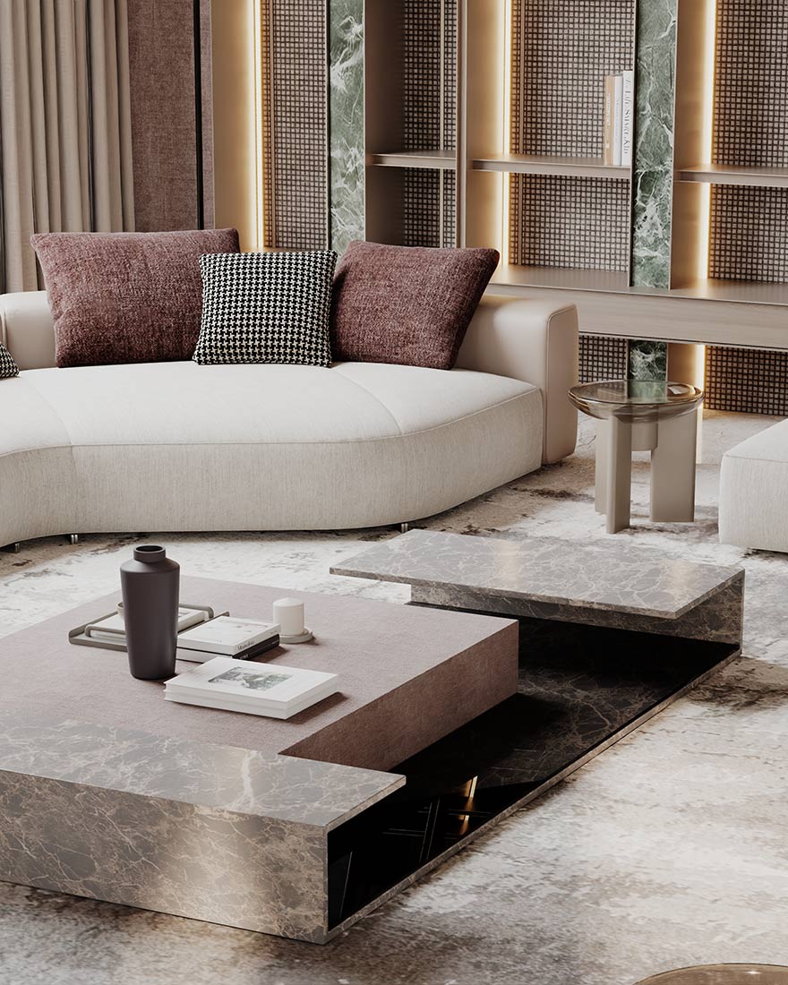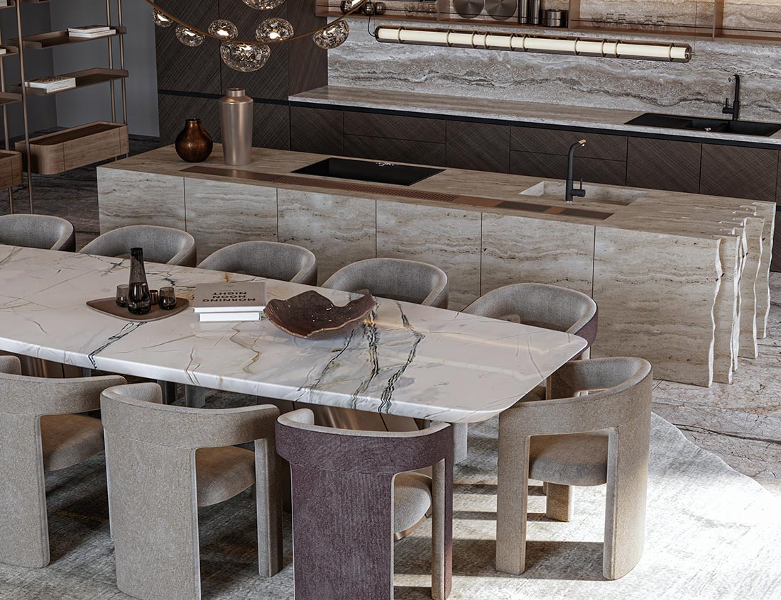 The open kitchen and dining area continue this material story with seamless transitions and bespoke detailing. Furniture pieces are sculptural yet inviting, merging Italian craftsmanship with contemporary sensibility.