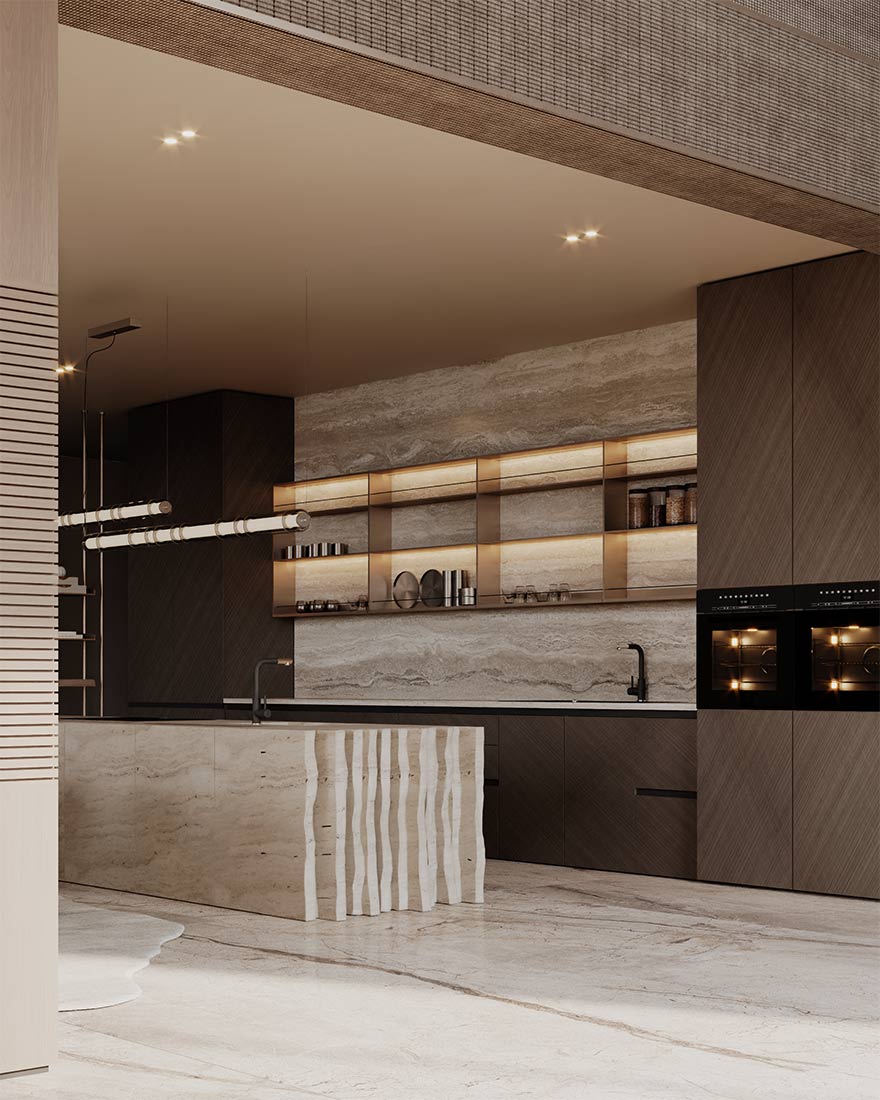 A palette of warm neutrals, brushed bronze, and natural stone creates visual harmony and calm sophistication. Fluted wood panels, onyx inserts, and rich travertine surfaces enhance depth and rhythm throughout.