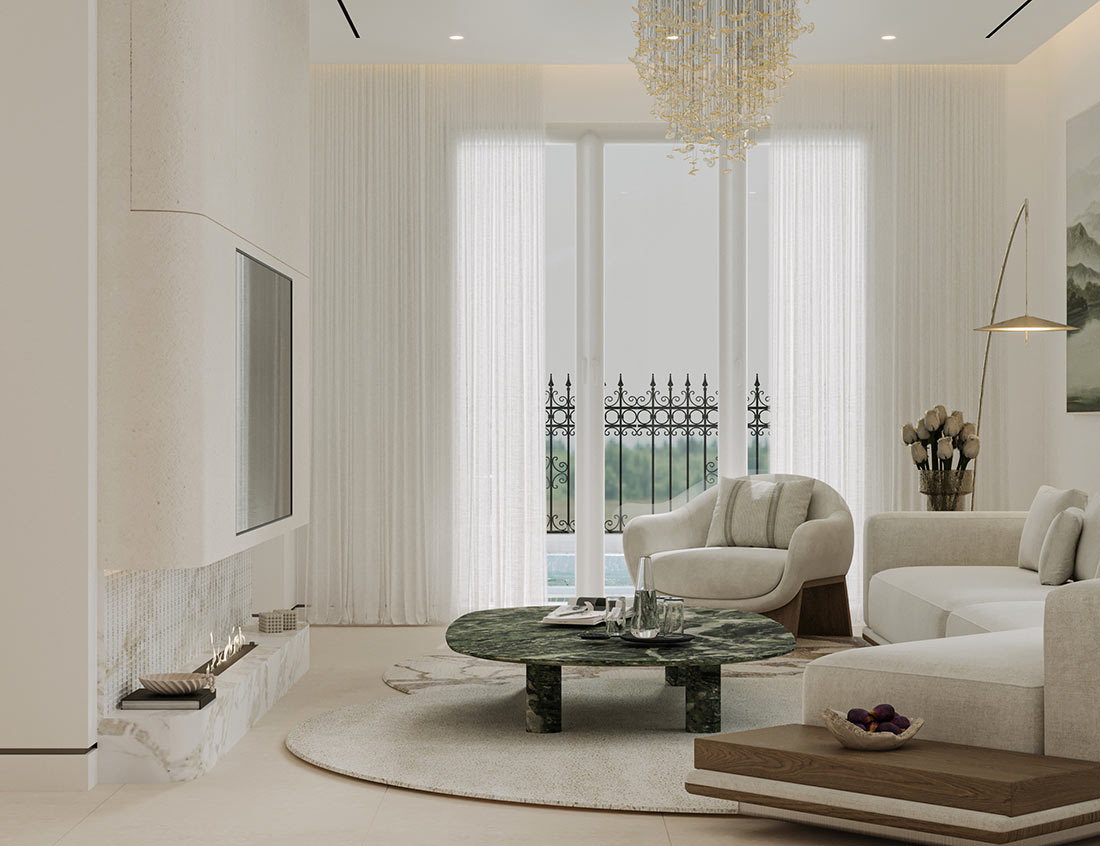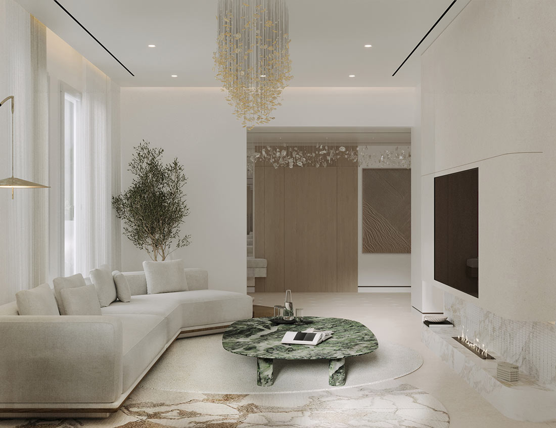 In the living room, light filters through sheer drapes, illuminating the statement green marble coffee table and a sculptural chandelier that crowns the space like floating gold leaves. The fireplace, clad in Calacatta marble, adds quiet drama while maintaining visual balance.