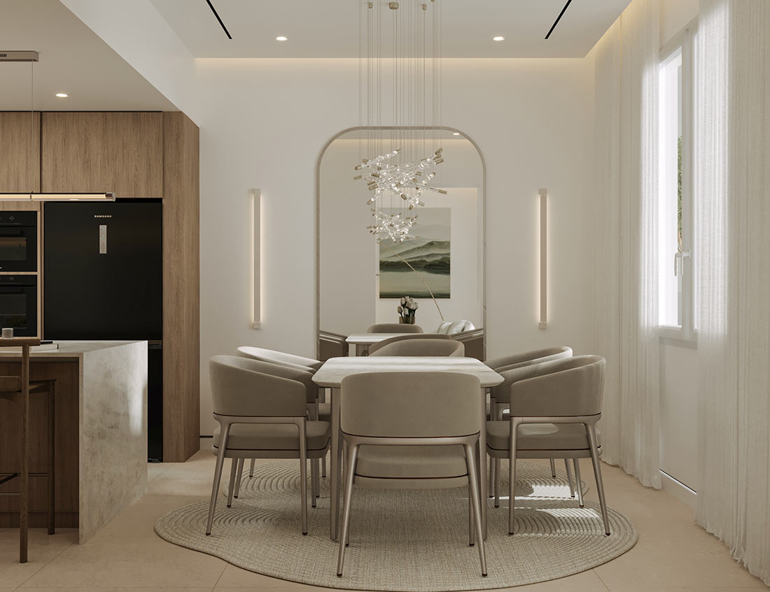 The ground floor unfolds with an open-plan composition — the kitchen, dining, and living areas unified under a palette of creamy neutrals, textured stones, and warm oak tones. The kitchen features a refined mix of natural wood cabinetry, soft marble finishes, and linear lighting that accentuates the sculptural precision of the island.
