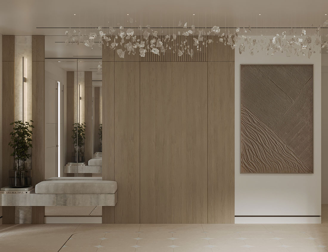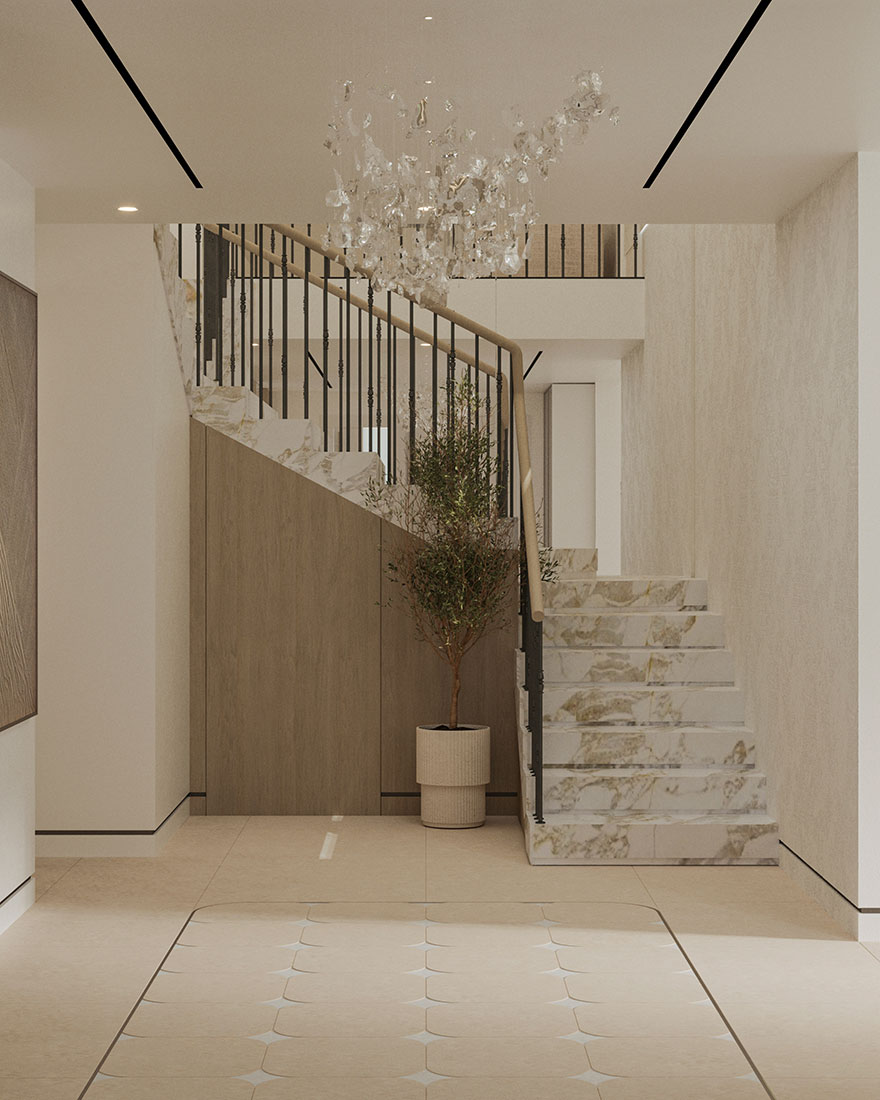 A sculpted staircase in book-matched marble leads to the upper level, embodying the villa’s dialogue between structure and softness. Each material — from the tactile wall panels to the delicate crystal light installations — contributes to an atmosphere that feels grounded, timeless, and exquisitely composed.
