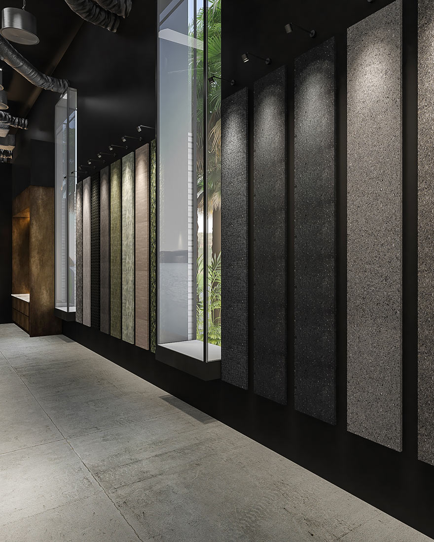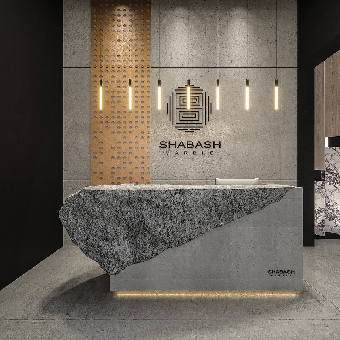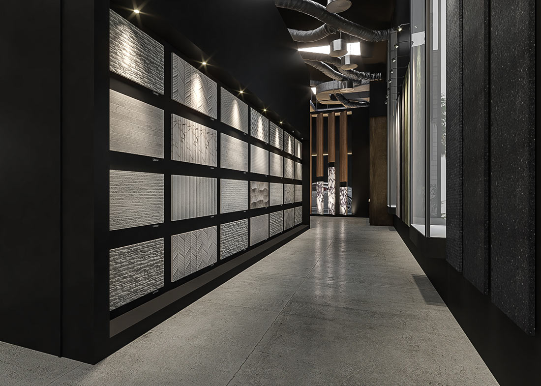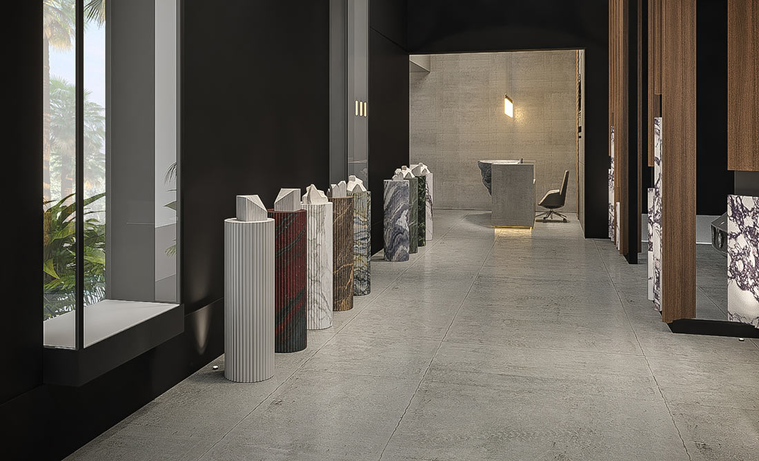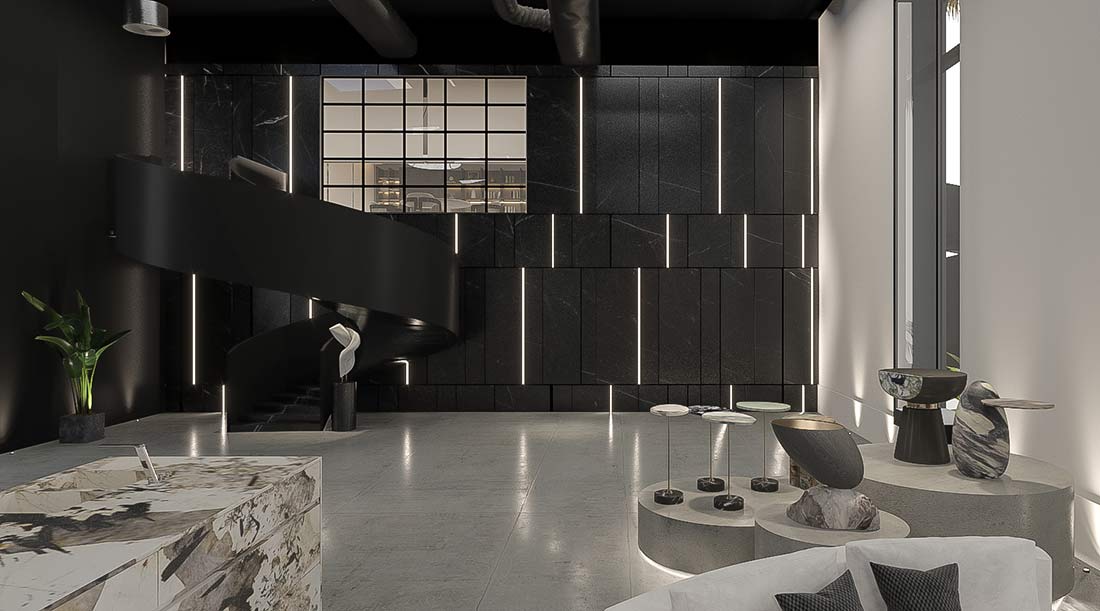 The double-height exhibition hall welcomes visitors into an immersive environment where natural stone takes center stage, illuminated by a choreography of light that enhances its organic veins and surfaces. The reception, defined by CNC-cut metal panels, introduces a sense of precision and modern elegance.