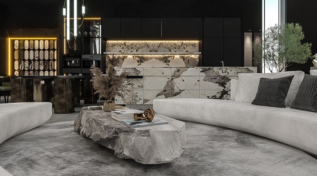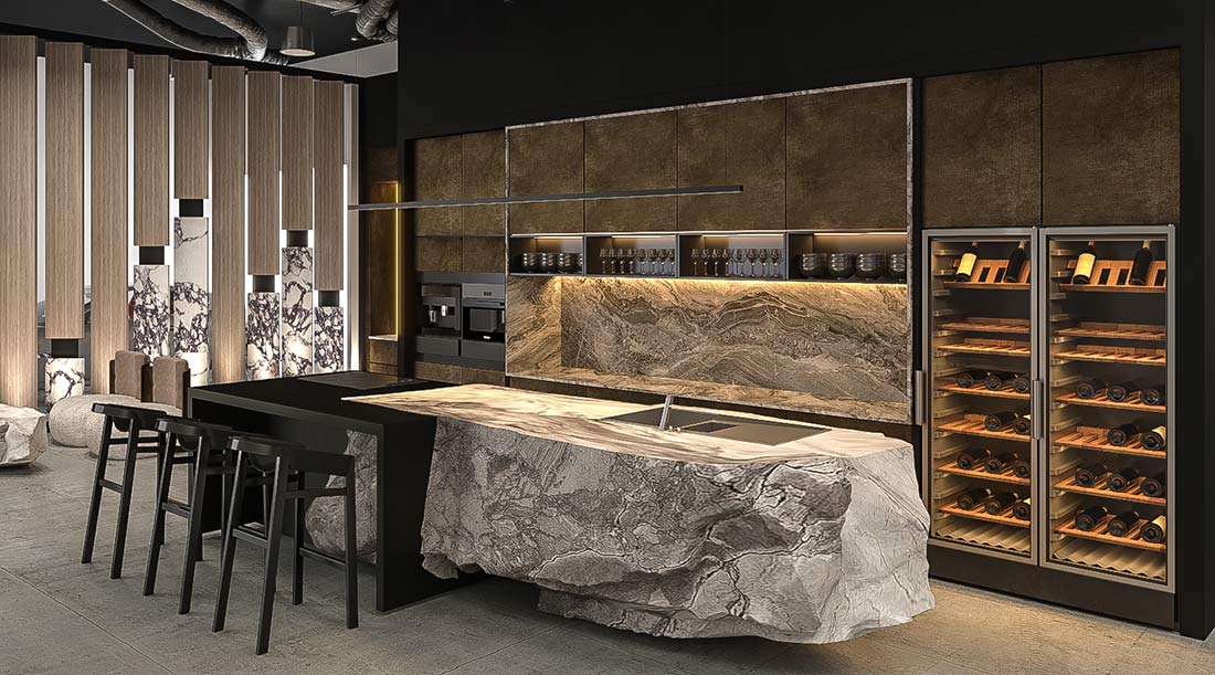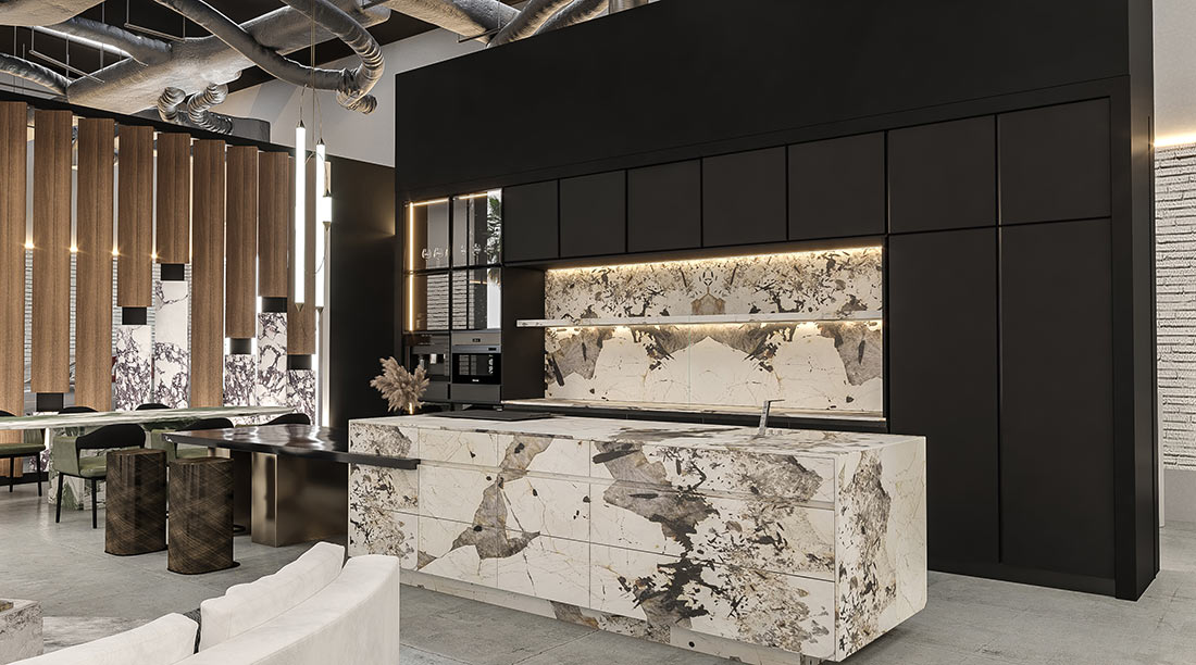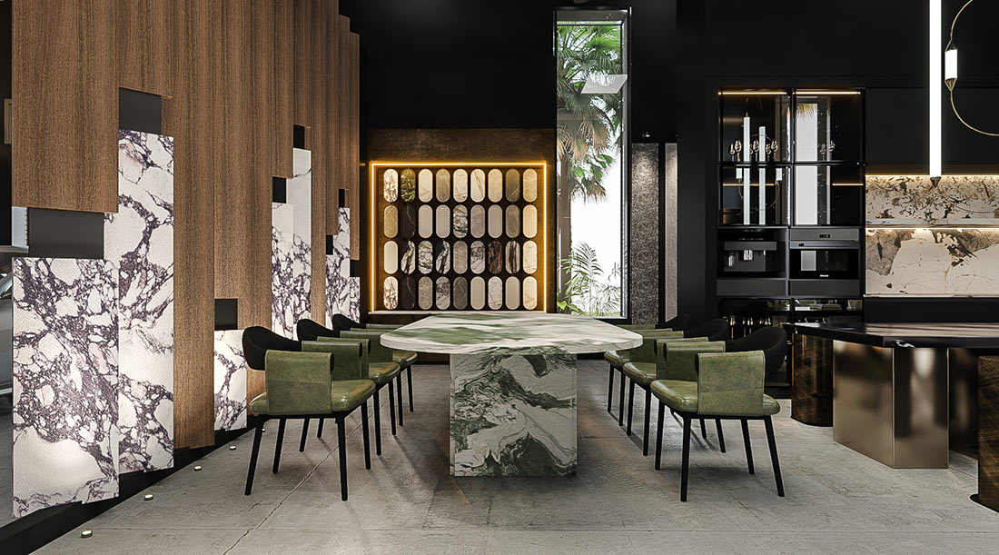 Curated zones flow seamlessly through the space — a marble dining table, display kitchen with sculptural island, and lounge anchored by monolithic art pieces — each illustrating marble’s versatility across interior applications. A tactile sample corridor invites exploration of surface textures, while the mezzanine above houses the executive suite overlooking the gallery.